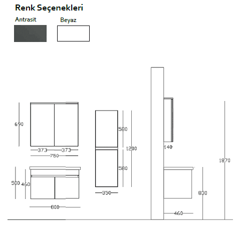 Bagnora MARE 65 cm Banyo Dolabı - Beyaz/Antrasit (Boy Dolaplı)