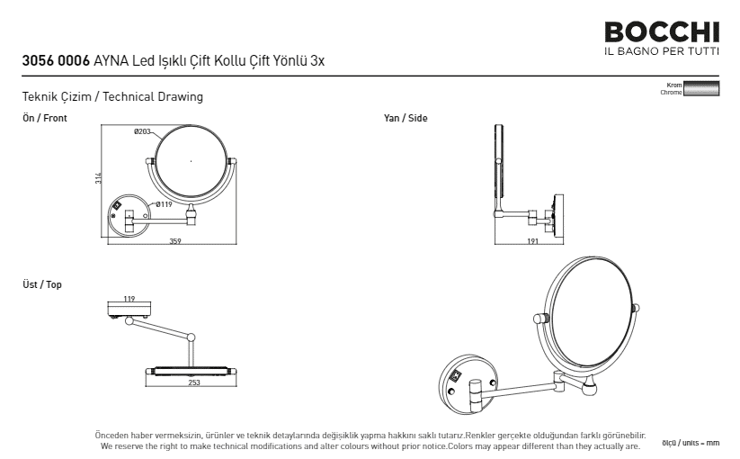 Bocchi Ayna Büyüteçli Çift Kollu Çift Yönlü Büyüteçli Ayna - Led Işıksız Çift Kollu Çift Yönlü 3x Krom