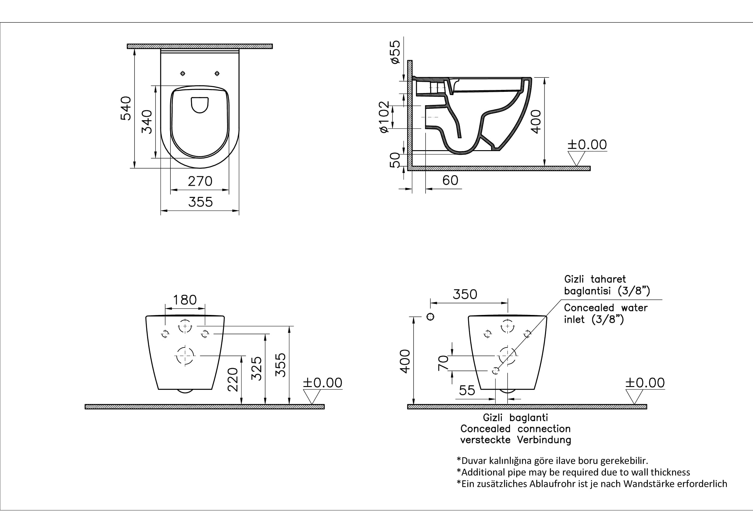 Vitra S60 Asma Klozet SmoothFlush, Gizli Montajlı, 54 cm Taharet Borulu, Taharet Borusu Girişi Sıva Altı Uygulamalı, Mat Siyah