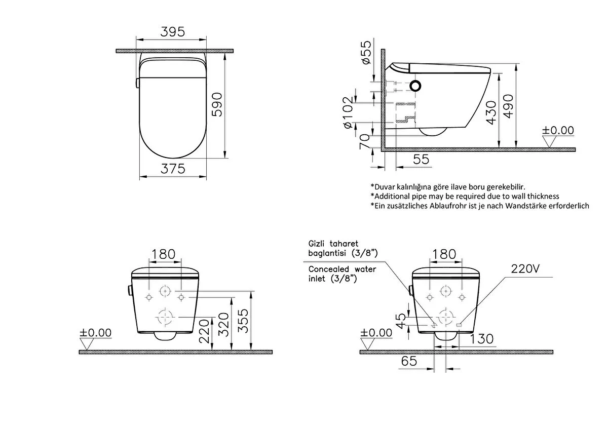 Vitra V-Care Comfort Akıllı Asma Klozet Rim-ex, 60 cm Temassız, Taharet Borulu, Taharet Borusu Girişi Sıva Altı Uygulamalı, Clean, Beyaz